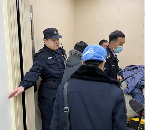 當(dāng)天上午,正在政務(wù)中心南門執(zhí)勤的保安員周彪和婁前松,發(fā)現(xiàn)一輛120救護(hù)車駛來(lái),兩人便上前詢問(wèn)情況,在得知六樓食堂有人突發(fā)心臟病后,第一時(shí)間將情況上報(bào)給了分隊(duì)長(zhǎng)呂偉,呂偉得知情況后,考慮到救援人員攜帶擔(dān)架和急救設(shè)備等特殊情況,他迅速反應(yīng),指示周彪快速引導(dǎo)救援人員走距離最近的貨梯上樓,同時(shí)管控該貨梯此段時(shí)間使用。說(shuō)話間,呂偉已經(jīng)同時(shí)趕到了事發(fā)地。